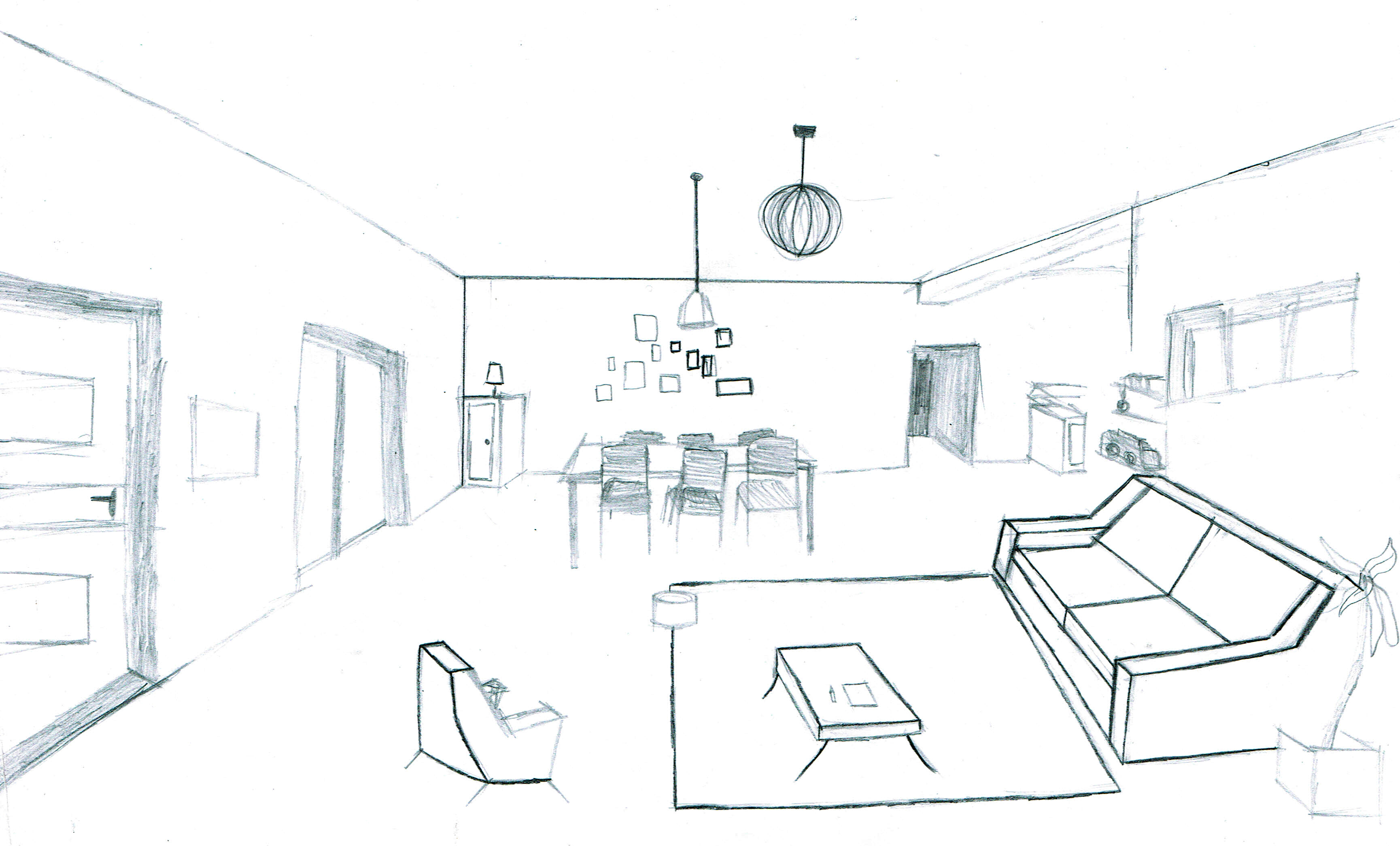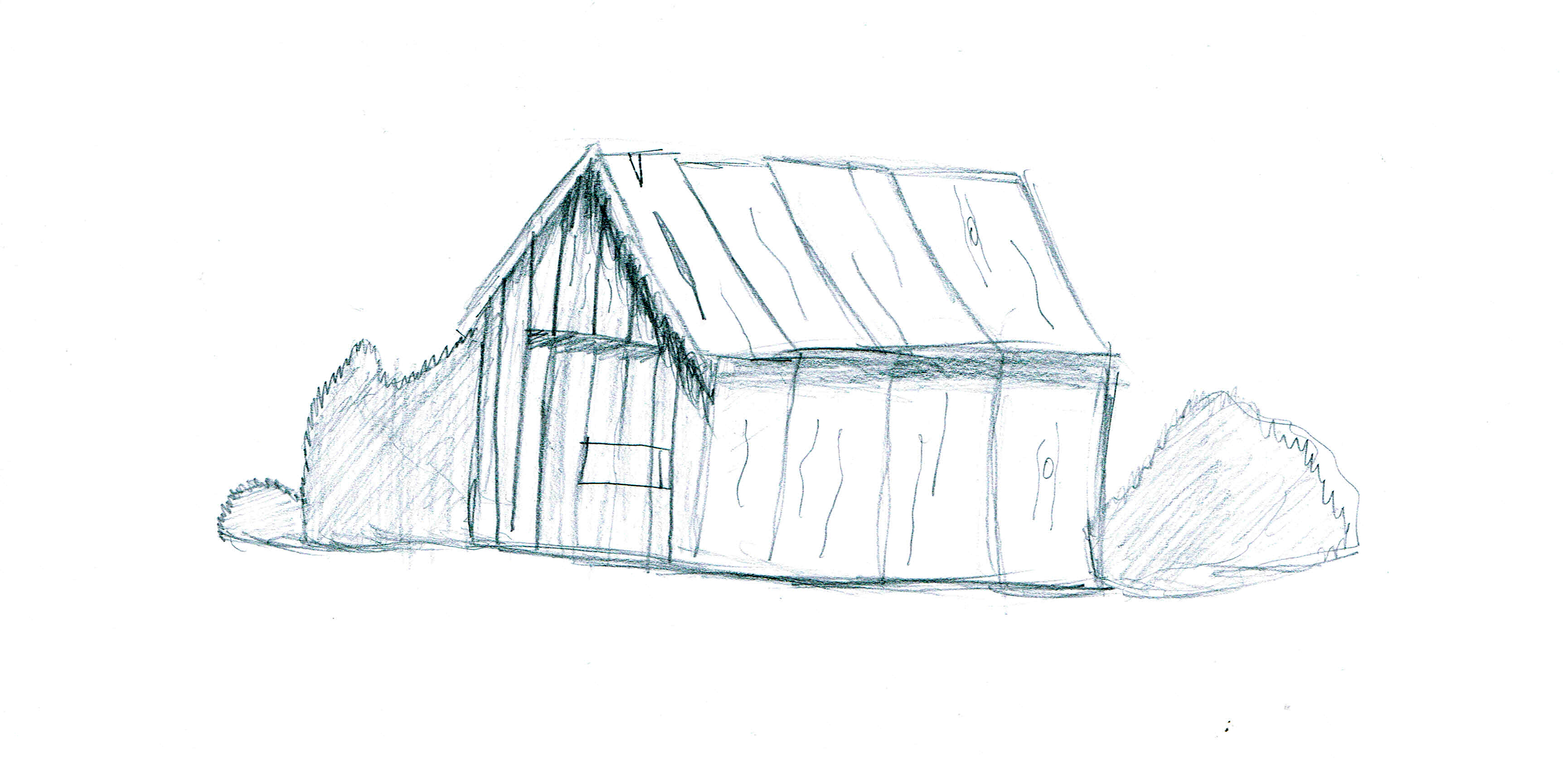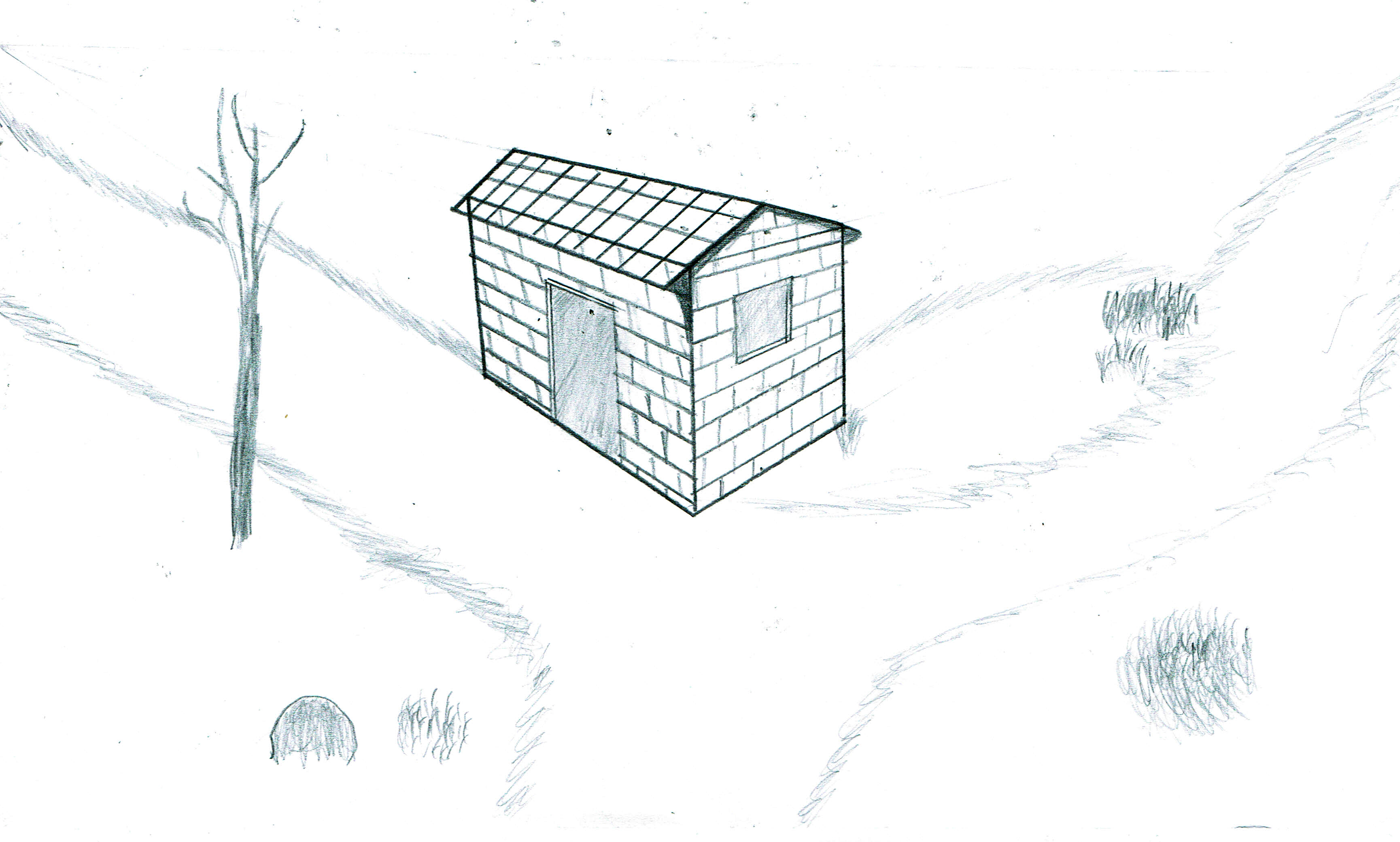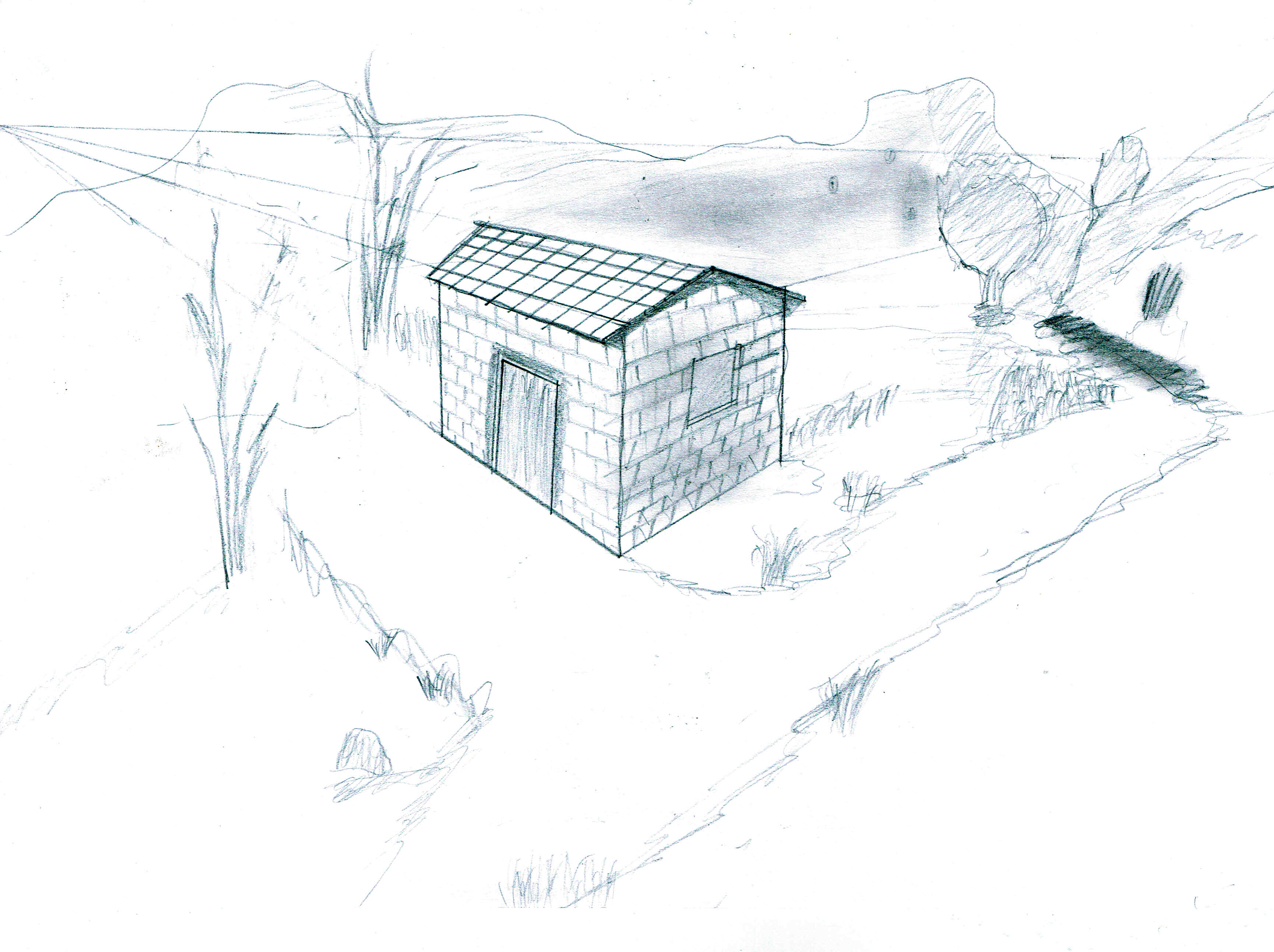 deuxième croquis de maison en pierre avec deux points de fuite.